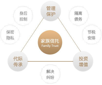 家族信托是为了私人资产的安全保障、家族成员的代际传承而设立的保护型信托,其主要功能仅仅是投资增值,更多的是让受托人根据信托协议的约定和委托人的意愿,为了特定信托目的和受益人的利益,对信托财产进行管理和保护。因此,家族信托更多体现的是事务管理型功能,进而实现保密隐私、隔离债务、节税安排、身后控制等财产保护和传承目标。